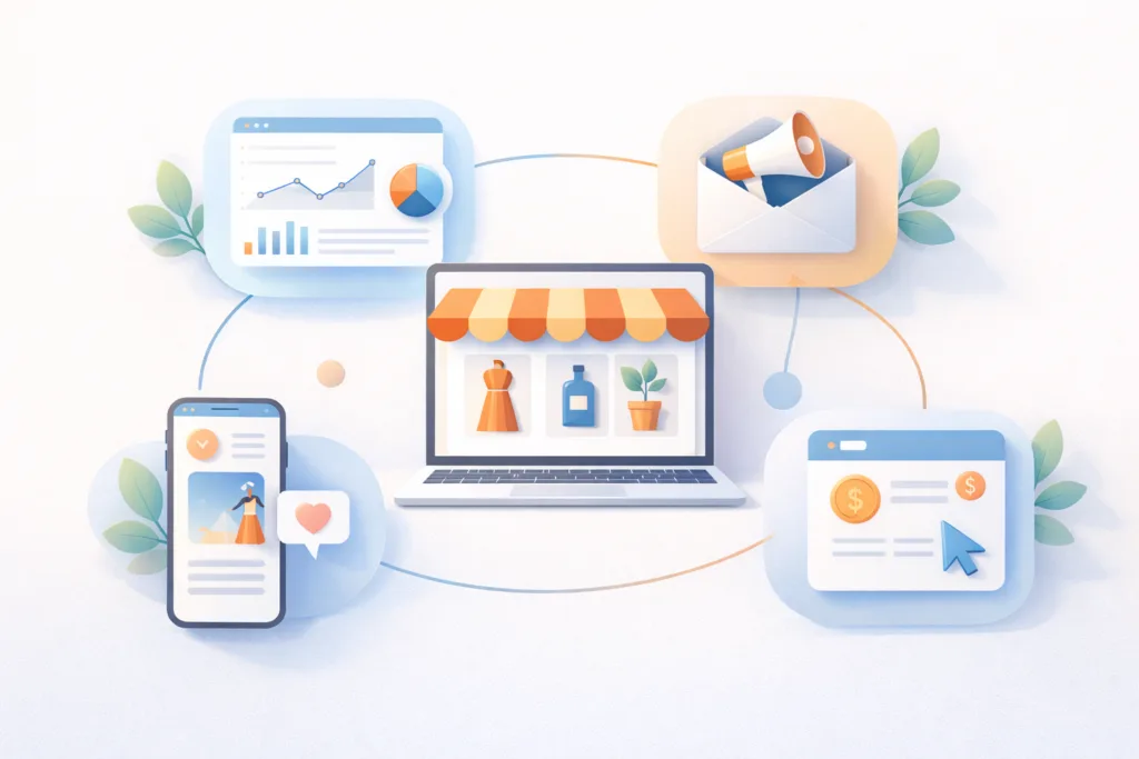 A Shopify or WooCommerce site becomes the central hub of your e-commerce strategy. Marketplaces feed traffic into it, while email marketing, SEO, and paid ads build long-term value. This approach reduces dependence on algorithms and third-party policies.
